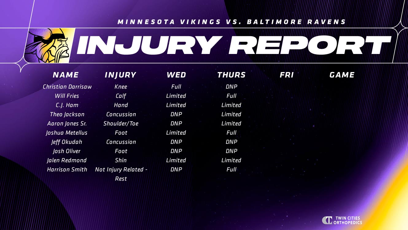 FB C. J. Ham (hand) and DT Jalen Redmond (shin) were limited during the week but are expected to be fit for the game. G Will Fries (calf) and S Josh Metellus (foot) both returned to full practice on Thursday after being limited on Wednesday, and should both play.